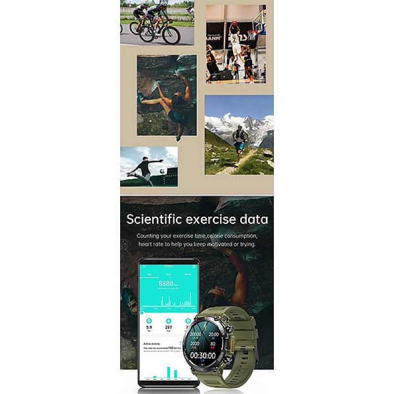 Το Smartwatch K76 Pro υψηλής αντοχής συνδυάζει αξιοπιστία και ποικιλία λειτουργιών για ενεργή και άνετη καθημερινή χρήση. Με μια οθόνη LTPS LCD 1,4" Touch Screen και κορώνα 50mm, παρέχει άνετη πρόσβαση στις λειτουργίες. Μπορείτε να επιλέξετε ανάμεσα σε 100 διαφορετικά watchfaces για προσαρμογή στο στυλ σας. Επιπλέον, περιλαμβάνει Music Player, ειδοποιήσεις για κλήσεις, μηνύματα και εφαρμογές, και πλήρη έλεγχο ποιότητας ύπνου. Μετράει τους καρδιακούς παλμούς, την πίεση αίματος και το επίπεδο οξυγόνου, ενώ παρέχει επίσης μετρήσεις βημάτων και καύσης θερμίδων. Με μπαταρία διάρκειας 10 ημερών (400mAH) και πιστοποίηση IP68 για αντοχή, είναι η ιδανική συντροφιά για όλες τις δραστηριότητες σας.
