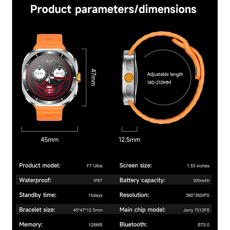 Ανακαλύψτε το Smartwatch F7 με IPS LCD οθόνη 1,53" Touch Screen (360x360) και 100 watchfaces για μοναδικό στυλ. Με λειτουργία Always On, NFC, και AI Assistant, προσφέρει πλήρη ευκολία. Διαθέτει μετρητές καρδιακών παλμών, πίεσης και οξυγόνου αίματος και υποστηρίζει κλήσεις μέσω Bluetooth για να είστε πάντα σε επαφή με τα αγαπημένα σας πρόσωπα. Με μπαταρία 300mAh για 10 ημέρες αναμονής, πιστοποίηση IP67, και τεχνολογία Anti Scratch, είναι συμβατό με iOS και Android για απόλυτη συνδεσιμότητα.