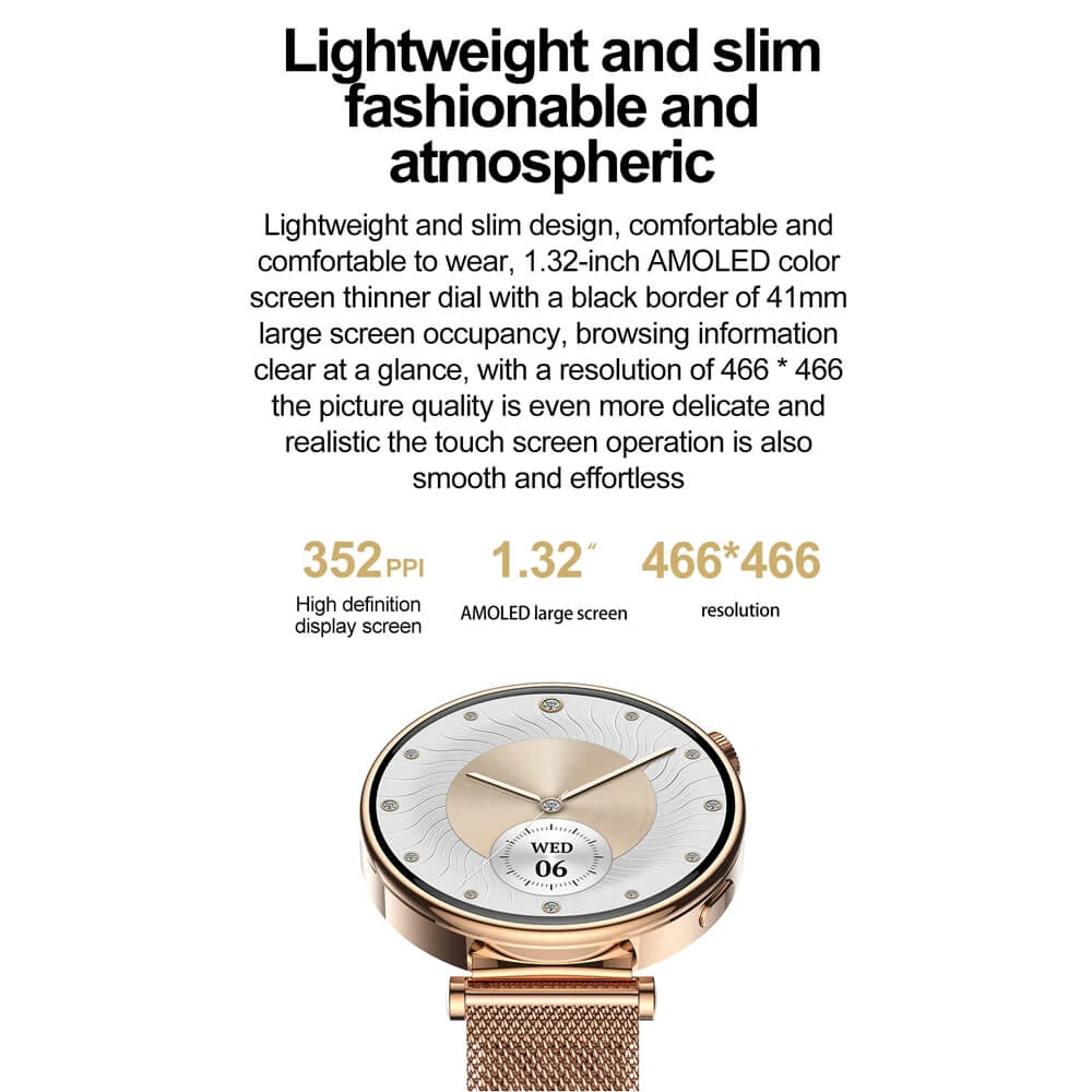 Το γυναικείο Smartwatch MK41 είναι ένα εξαιρετικά λειτουργικό αξεσουάρ που συνδυάζει υψηλή τεχνολογία με κομψό σχεδιασμό. Διαθέτει οθόνη Amoled 1,32" Touch Screen με 460X460 ανάλυση και ελληνικό μενού για άνετη χρήση. Με 100 watchfaces για προσαρμογή στο στυλ σας. Παρέχει πλήρη έλεγχο της ποιότητας του ύπνου, μέτρηση καρδιακών παλμών, πίεσης αίματος και οξυγόνου αίματος, καθώς και μετρητή βημάτων και καύσης θερμίδων. Επιπλέον, προσφέρει λειτουργία απάντησης κλήσεων μέσω Bluetooth, έλεγχο κάμερας smartphone και αναμονή μπαταρίας έως και 10 ημέρες. Η πιστοποίηση IP68 του το καθιστά ανθεκτικό στο νερό.
